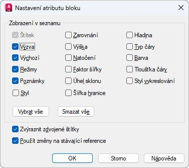 Určuje vlastnosti, které se zobrazí v seznamu atributů. V seznamu se zobrazí jen vybrané vlastnosti. Vlastnost Štítek je vždy vybrána.