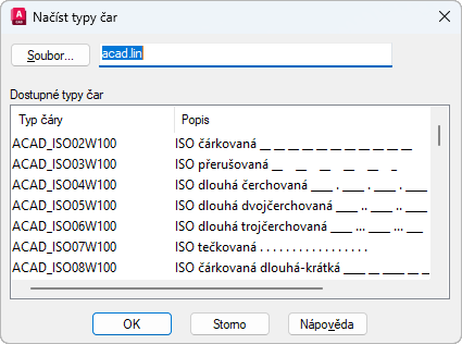 Zobrazí název aktuálního souboru s typy čar (LIN). Je možné zadat název jiného souboru LIN nebo pomocí tlačítka Soubor vybrat soubor v dialogu Vybrat soubor typu čáry.