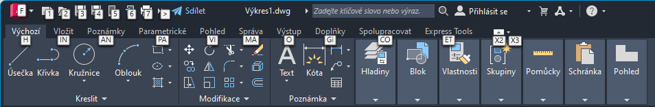 Výběr možností v nabídkách, na panelu nástrojů Rychlý přístup a v pásu karet lze provádět stisky kláves namísto ukazovacím zařízením. Chcete-li zjistit, které kláves jsou v aktuálním pracovním prostoru k dispozici, stiskněte klávesu Alt.