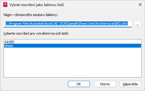 Určuje cestu ke složce, soubor šablony výkresu (DWT) a název rozvržení, jehož pomocí jsou vytvořeny nové listy.