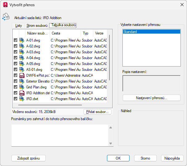 Implicitně jsou všechny soubory spojené s aktuálním výkresem (jako jsou externí reference, styly vykreslování a písma) uvedeny v seznamu. Do přenosu můžete přidat soubory nebo existující odstranit. Soubory, které jsou odkazovány prostřednictvím URL, nejsou do přenosu zahrnuty.
