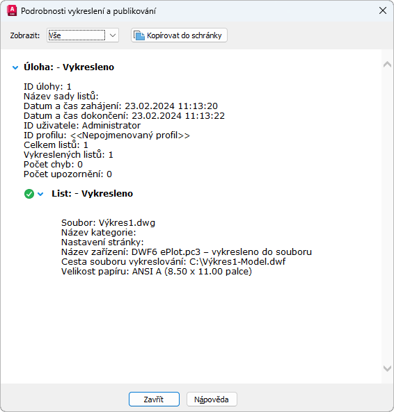 Zobrazí informace o dokončených úlohách vykreslování a publikace a listech těchto úloh.