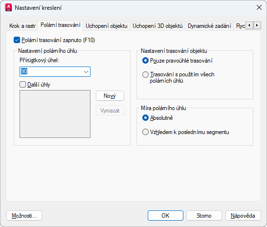Pokud vyberete Další úhly, vypíší se další úhly, které jsou k dispozici. Pro přidání dalších úhlů klikněte na Nový. Pro odstranění existujících úhlů klikněte na Vymazat. (Systémová proměnná POLARADDANG)