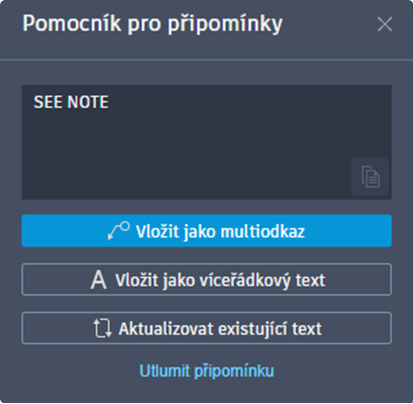 Po kliknutí na textovou připomínku se zobrazí možnost Aktualizovat existující text jako nová možnost v dialogu Pomocník pro připomínky vedle možností Vložit jako víceřádkový text a Vložit jako multiodkaz, které byly k dispozici v poslední verzi. Pomocí příkazu Aktualizovat existující text nahraďte nebo změňte existující text ve výkresu textem z importované připomínky.