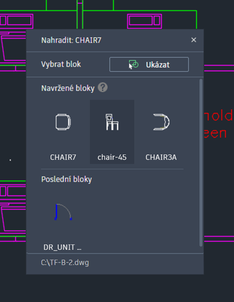 -NAHRAĎBLOK – na příkazovém řádku nahradí určené reference bloků blokem, který vyberete v seznamu navrhovaných bloků.