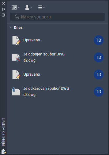 Přehled aktivit nabízí přehled o předchozích akcích, které jste s výkresy provedli vy nebo jiní uživatelé.
