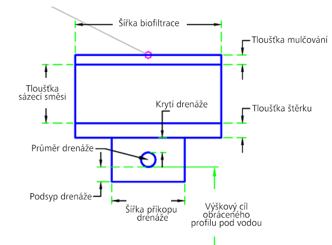 | Obrácený profil drenáže | Může se použít k přepsání pevné obrácené výšky drenážního potrubí. Jako cíle lze pro určení výšky použít následující typy objektů: profily, 3D křivky, návrhové linie nebo polygony zaměření. | Volitelný |