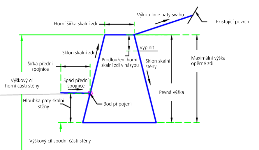 | Horní část stěny | Může se použít k přepsání horní výšky skalní zdi. Pokud se má tento parametr použít, musí být vstupní parametr Pevná výška nastaven na hodnotu Ne. Jako cíle lze pro určení výšky použít následující typy objektů: profily, 3D křivky, návrhové linie nebo polygony zaměření. | Volitelný |