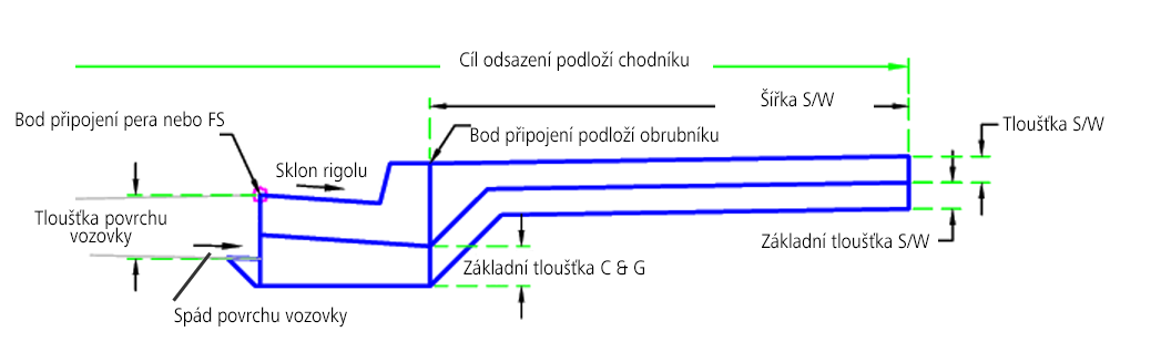 | Odsazení zadní části chodníku | Může se použít k přepsání pevné šířky chodníku a k navázání vnější hrany chodníku na trasu odsazení. Jako cíle pro určení šířky lze použít následující typy objektů: trasy, křivky, návrhové linie nebo polygony zaměření. | Volitelný |