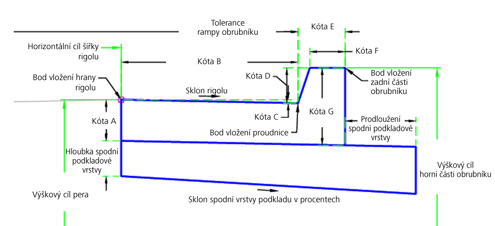 | Výška pera | Může se použít k přepsání sklonu rigolu a k navázání výšky pera obrubníku na výšku profilu. Jako cíle lze pro určení výšky použít následující typy objektů: profily, 3D křivky, návrhové linie nebo polygony zaměření. | Volitelný |