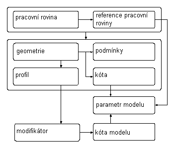Následující obrázek znázorňuje prvky, které dohromady tvoří model. Šipky označují směr vztahu mezi prvky. Změna geometrie například ovlivní profil, který má vliv na modifikátor atd. Tento obrázek vám pomůže porozumět vztahům mezi prvky v případě, že se chcete dozvědět o jednotlivých prvcích více.