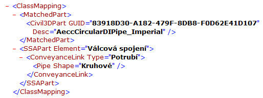 To znamená, že ve výchozím nastavení budou kruhová potrubí, které nejsou betonová, například potrubí ze žlábkovaného HDPE, přepnuta při importu na betonová. Následující příklad znázorňuje, jak nastavit soubor mapování součásti XML tak, aby byl typ potrubí zachován při importu.