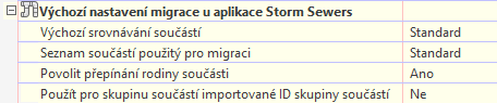 Výchozí nastavení párování součástí se nachází v nastavení prvku potrubních sítí v poli Výchozí nastavení migrace aplikace Storm Sewers.
