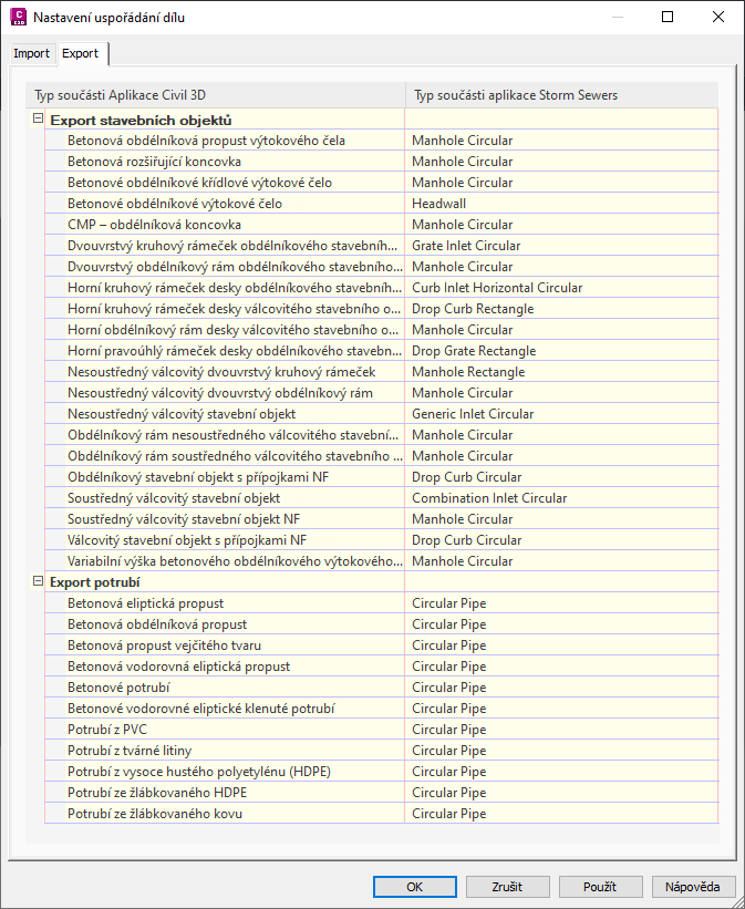 Karta Import umožňuje výběr rodiny součástí aplikace Autodesk Civil 3D (na pravé straně), které chcete použít u všech dostupných typů součástí rozšíření aplikace Storm Sewers. Typ součásti rozšíření aplikace Storm Sewers představuje pevný seznam. Toto mapování by mělo být rovno mapování exportu, aby rodiny součásti zůstaly stejné.