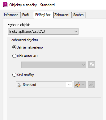 U promítání a křížení můžete nastavit různé styly, které se použijí pro jejich zobrazení a popisky v zobrazeních příčných řezů.