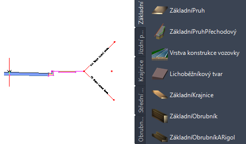 Šablona typických řezů vozovky (vlevo) s podsestavami uvedenými na paletě nástrojů (vpravo)