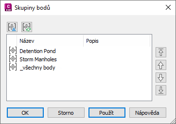 Pořadí zobrazení skupiny bodů pro výkres určuje pořadí, ve kterém jsou skupiny bodů zakresleny při otevření výkresu nebo novém generování obrázků. První (nejvyšší) skupina bodů v seznamu je zakreslena jako poslední.