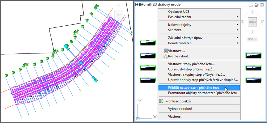 - Klikněte pravým tlačítkem myši a vyberte příkaz Přiblížit na stopu příčného řezu nebo Přiblížit na zobrazení příčného řezu.