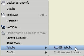 Tabulku kusovníku, děr nebo revizí, případně i obecnou tabulku, můžete rozdělit a oddělenou část pak přesunout do nového umístění nebo na nový list.