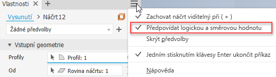 Možnosti výstupu booleovské operace se ukládají do předvoleb příkazů Vysunutí, Rotace, Tažení a Spirála. Pokročilé nastavení u příkazů Vysunutí a Rotace, Předvídat booleovskou operaci a směr, určuje, že má software předvídat výběr booleovské operace na základě profilu a těles v modelu. Nastavení přepíše možnost booleovské operace v předvolbě.