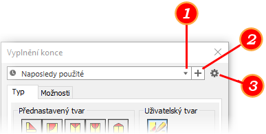 Předvolba Naposledy použité je tvořena parametry, které byly použity pro poslední umístěný prvek tohoto typu. Předvolba Naposledy použité se zobrazí v případě, že pro nově vytvářený prvek zatím žádná předvolba uložena nebyla. Předvolbu Naposledy použité můžete použít v nezměněné podobě nebo její hodnoty upravit. Změněnou předvolbu můžete kdykoli uložit jako novou, stačí kliknout na možnost