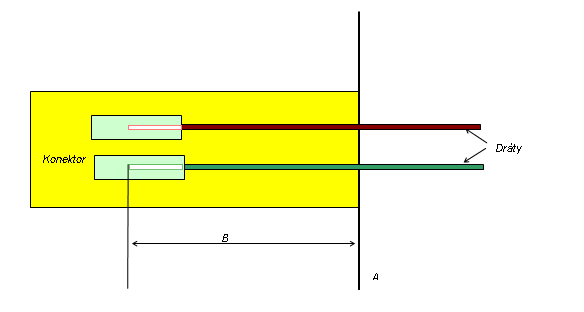 B: Vzdálenost mezi rovinou A a bodem, kde končí vložený drát. U konektoru s různými velikostmi dutin by se B mohlo lišit pro jednotlivé vložené dráty v závislosti na hloubce dutiny. V tomto příkladě by B mohlo být rovno B1 nebo B2.