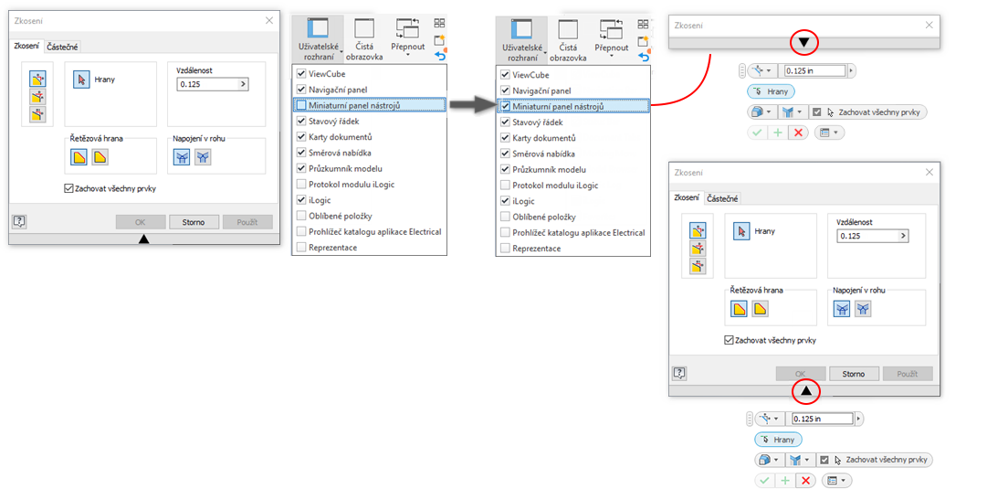 V aplikaci Inventor je několik dialogů, u kterých se může zobrazovat miniaturní panel nástrojů.