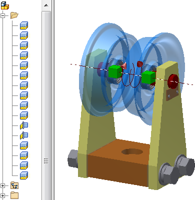 Na následujícím obrázku jsou k vyhledání komponenty a definování stupňů volnosti použity dva typy spoje sestavy: pevný a rotační. Protože příkaz Spoj explicitně definuje umístění komponenty a stupně volnosti, je k zajištění konzistentních a předvídatelných výsledků třeba méně připojení. Všimněte si, že pevné připojení je nejběžnější typ spoje a otáčejí se pouze dvě ložiska. Jinými slovy pohyb sestavy všech komponent je definován správně. K získání požadovaných výsledků můžete použít spoje s vazbami.