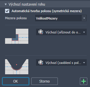 Nastaví velikost výštipu pro vybraný roh. Použije výchozí velikost definovanou ve stylu plechu. Kliknutím na ikonu vpravo přepíšete výchozí nastavení.