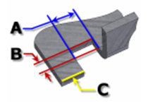 Jedná se o přijatelný tvar ohybu, který je výsledkem vady materiálu. Tato možnost je běžná, jsou-li vyžadovány ostré ohyby nebo při použití určitých materiálů. V následující ilustraci písmeno C představuje velikost zbytku materiálu po vytvoření ohybu s výštipem. Tento parametr má výchozí hodnotu zadanou v dialogu Styl plechu. Pomocí této možnosti je možné parametr prvku jednotlivě upravovat.