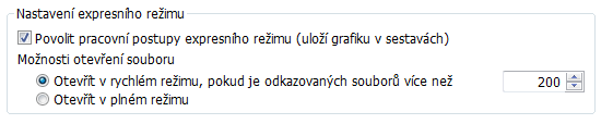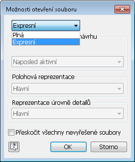 Možnost Načíst expresně poskytuje podstatně rychlejší (trojnásobnou až pětinásobnou) rychlost otevření velkých sestav. Expresní režim způsobí, že se data rozšířeného zobrazení (grafika z mezipaměti), uloží do souboru sestavy (.iam). Tato dodatečná data, označovaná jako data expresního režimu, umožňují aplikaci Inventor otevřít sestavu rychleji.