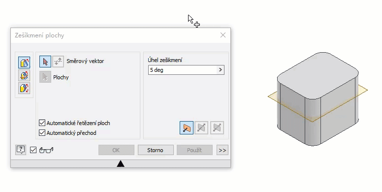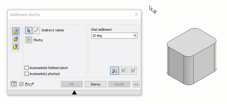 Chcete-li zachovat přilehlé přechodové prvky, například zaoblení, vyberte příkaz Automatický přechod. Pokud nechcete, aby byly přechodové prvky zahrnuty do zešikmení, vypněte Automatické přechody.