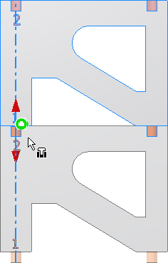 U vazeb otočení-posunutí určuje vzdálenost, o jakou se posune druhý výběr vzhledem k jedné otáčce prvního výběru. Například při hodnotě 4.0 mm se přemístí druhý výběr o 4.0 mm při úplné otáčce prvního výběru. Pokud je první výběr válcový povrch, zobrazí a vypočítá se výchozí vzdálenost, která je obvodem prvního výběru.