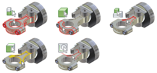Vybrat plochy a hranyNastaví příkaz tak, aby na libovolné součásti v sestavě vybíral plochy. Můžete zvýraznit a vybrat plochy nebo jednotlivé křivky, které definují plochy.