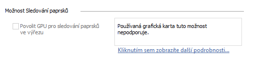 Režim GPU využívá k rendrování sledování paprsků jednotku GPU, čímž uvolní CPU k provádění dalších úloh. Tato možnost je povolena, když je k dispozici kompatibilní jednotka GPU.