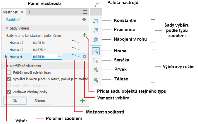 Ovládací prvky palety nástrojů umožňují přidání více různých velikostí a typů zaoblení v jedné relaci příkazu: