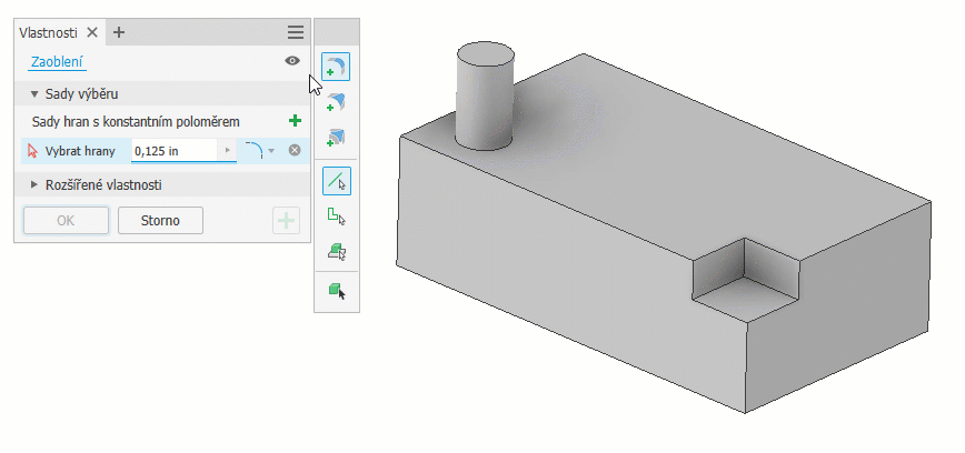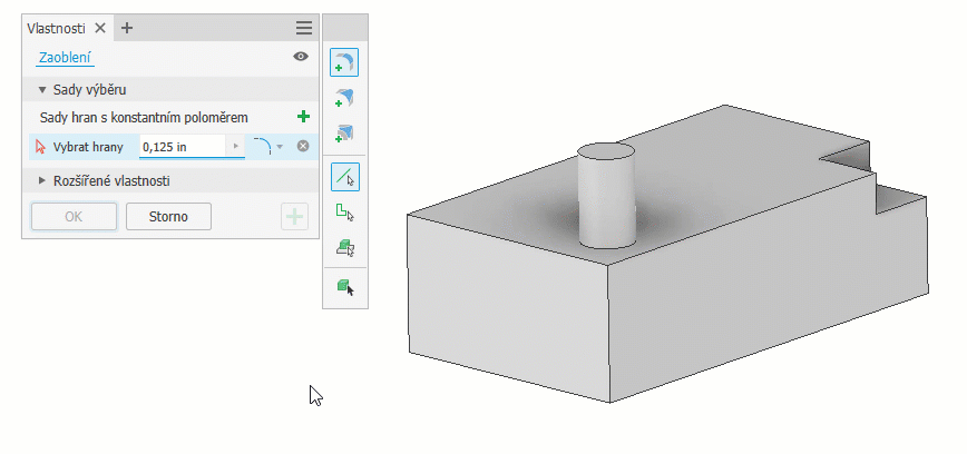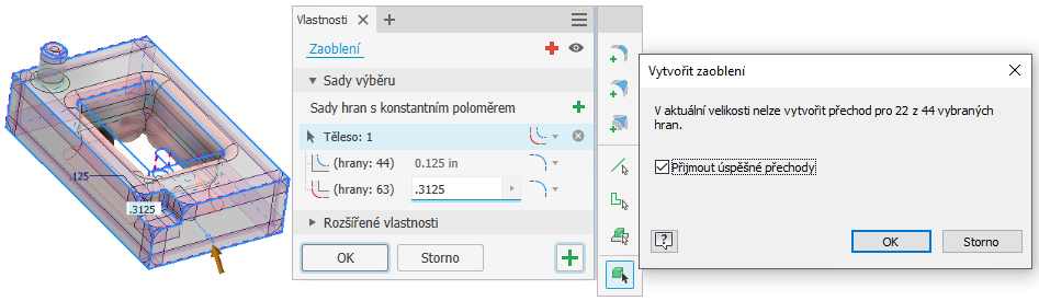 Všechna zakulacení – použijí se pouze zakulacení.Pokud není automaticky vybráno, vyberte cílové těleso. Náhled zaoblení a zakulacení se zobrazí na kreslicí ploše. Zobrazí se i náhled prvků.