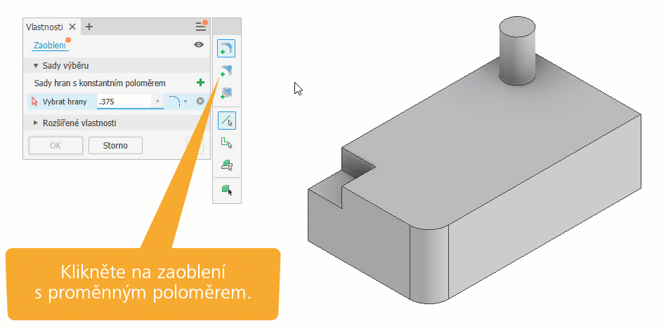 Zaoblení s proměnným poloměrem. Panel vlastností se rozbalí a zobrazí se další vstupní pole.