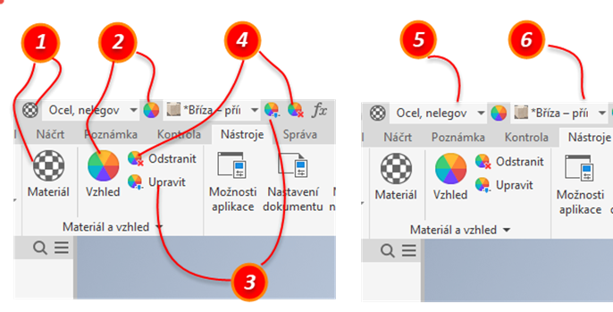 Přístupové body k možnostem Materiál, Vzhled a Zrušit přepsání: