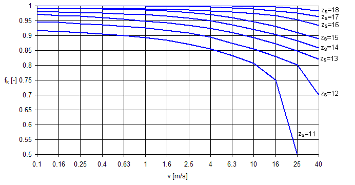 Součinitel Rychlost řetězu zohledňuje rychlost řetězu v [m/s] pro určitý počet zubů nejmenšího řetězového kola z s [-]. Pokud má nejmenší řetězové kolo v pohonu 19 nebo více zubů, tento součinitel se vždy rovná jedné. Pokud má nejmenší řetězové kolo méně než 19 zubů, součinitel rychlosti se vyhledá z následujícího diagramu.
