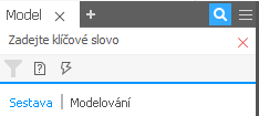 Možnost Najít otevře vyhledávací pole, ve kterém můžete vyhledat objekty odpovídající kritériím vyhledávání. Pomocí příkazu Najít můžete vyhledat chybné vztahy, potlačené komponenty nebo prvek, názvy parametrů náčrtu, hodnoty nebo jiných kombinací kritérií.