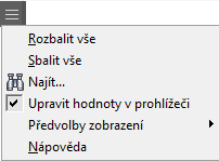 Místní nabídka (pravé tlačítko) nabízí funkce pro operace ve vybrané komponentě, prvku nebo vztahu v prohlížeči. Položky v nabídce závisí na konfiguraci prohlížeče a vybrané položce.
