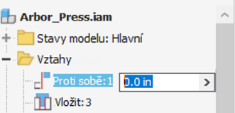Možnost Vztahy zobrazí sekvenční seznam všech spojů a vazeb v sestavě. Geometrii vazby můžete rychle změnit nebo změřit výběrem položky ve složce Vztahy. V nabídce prohlížeče musí být povolena možnost Upravit hodnoty v prohlížeči.