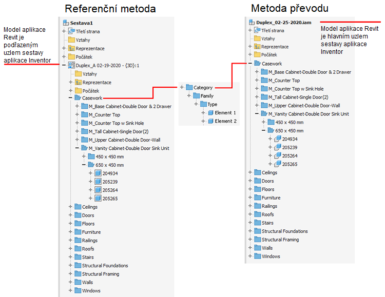 Existují dva režimy používání modelů aplikace Revit v aplikaci Inventor: Reference a Převést. Oba zahrnují import 3D pohledů aplikace Revit. Vyberte režim, který splňuje vaše požadavky.