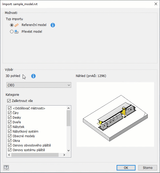 3D pohled vyberte 3D pohled, který chcete importovat. Nad náhledem je uveden počet prvků aplikace Revit, které mají být importovány.