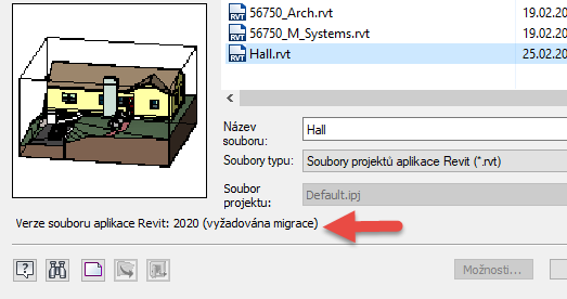 V dialogu Otevřít se zobrazí náhled souboru a verze aplikace Revit použitá k poslední úpravě dat.