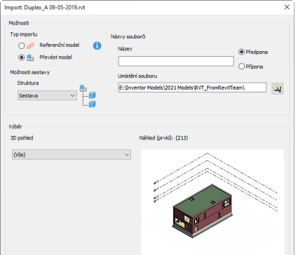 Referenční model se do sestavy aplikace Inventor importuje pod stejným názvem, jako má soubor aplikace Revit, s připojeným názvem pohledu.