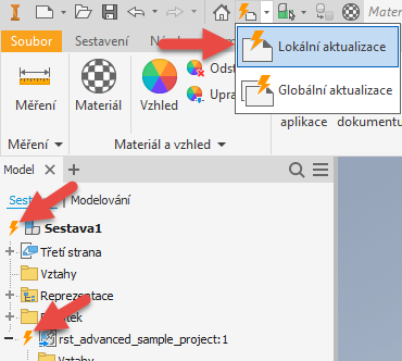 Když uvidíte symbol blesku, můžete kliknutím na příkaz Lokální aktualizace použít všechny nevyřízené změny, jak u modelu aplikace Revit, tak u komponent aplikace Inventor. Aktualizace mohou ovlivnit závislosti, například vazby a adaptivní součásti.