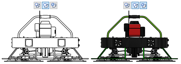 zobrazí v pohledu barvy modelu. Následující obrázek znázorňuje stejný pohled typu „Skrytá čára odebrána“ jednou se zapnutou možností Stínovaný a jednou s vypnutou možností Stínovaný.