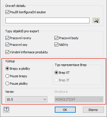 Pokud vyberete verzi 10.3 a vyšší, nebude možnost Brep JT dostupná.